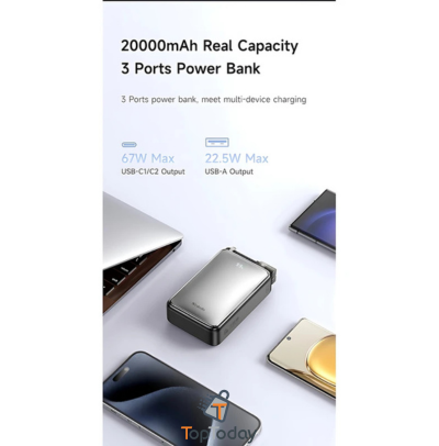 • توان کلی خروجی: این پاوربانک در مجموع 67 وات خروجی دارد، که باعث میشود دستگاههای مختلف، از گوشیهای هوشمند گرفته تا لپتاپها و مکبوکها، با سرعت بالا شارژ شوند.